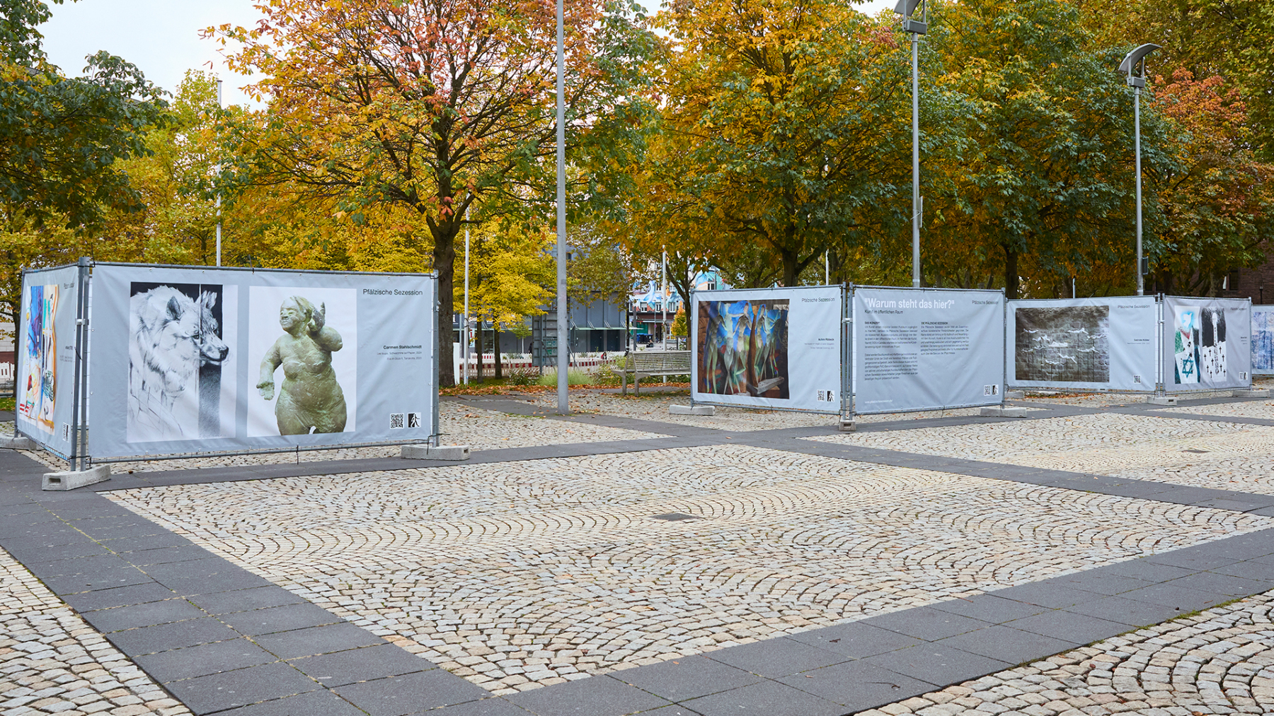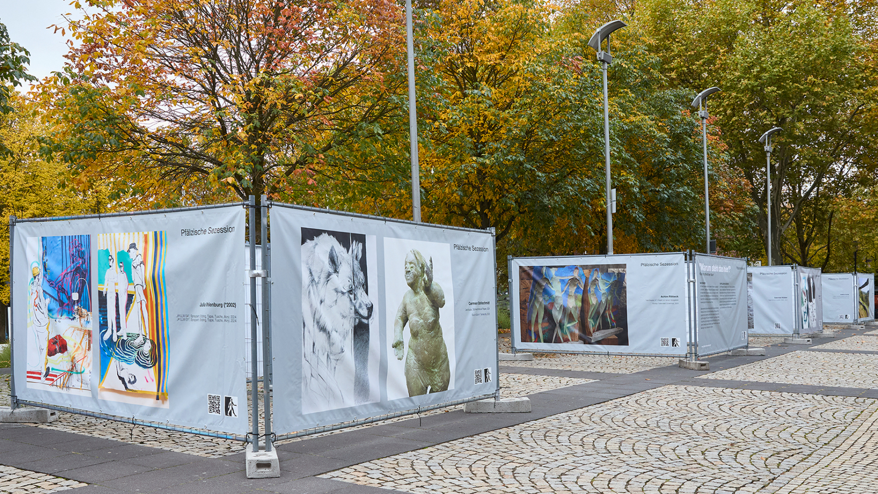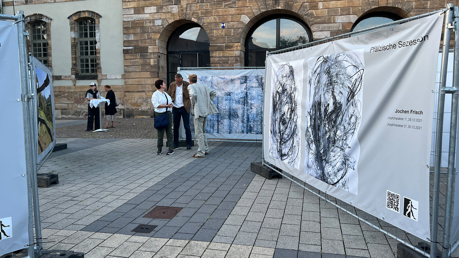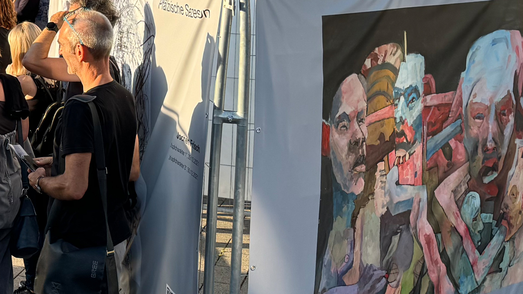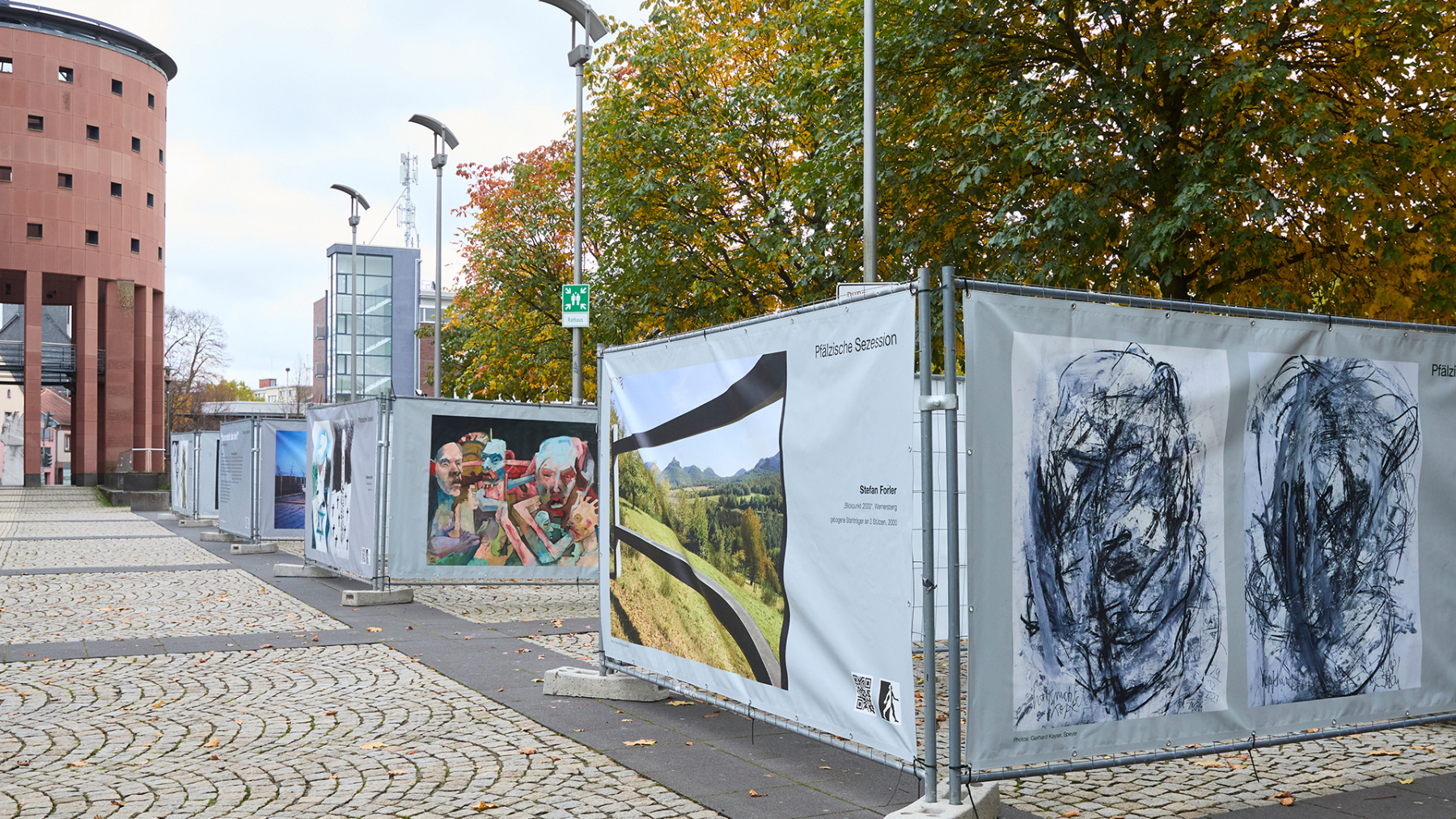 Die Pfälzische Sezession brachte 16 großformatige Banner mit aktuellen Kunstwerken (Malerei, Grafik, Plastik) nach Kaiserslautern, das Citymanagement kümmert sich um die entsprechende Infrastruktur für die Ausstellung: 4 Wochen im Spätherbst- eine Kunstausstellung im öffentlichen Raum, für alle Menschen in der Stadt, 24 Stunden am Tag. Da dieser Platz gerne von jungen Menschen unterschiedlicher Nationalität genutzt wird, war es super zu erleben, wie Kunst jenseits von Sprach- oder Kulturunterschieden angenommen wird. Die Vernissage auf dem Theatervorplatz wurde künstlerisch begleitet von Present Art Collection (H. Engelhardt, Martin Haberer). Trotz Regen kamen Besucher und es gab wieder regen Austausch über Kunst, begleitet von Musik und Cremant … Germersheim in der Planung/2026