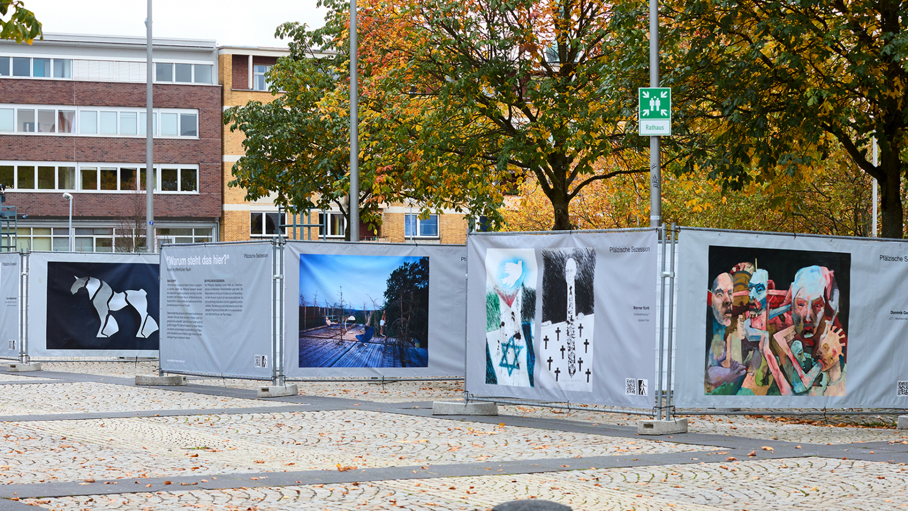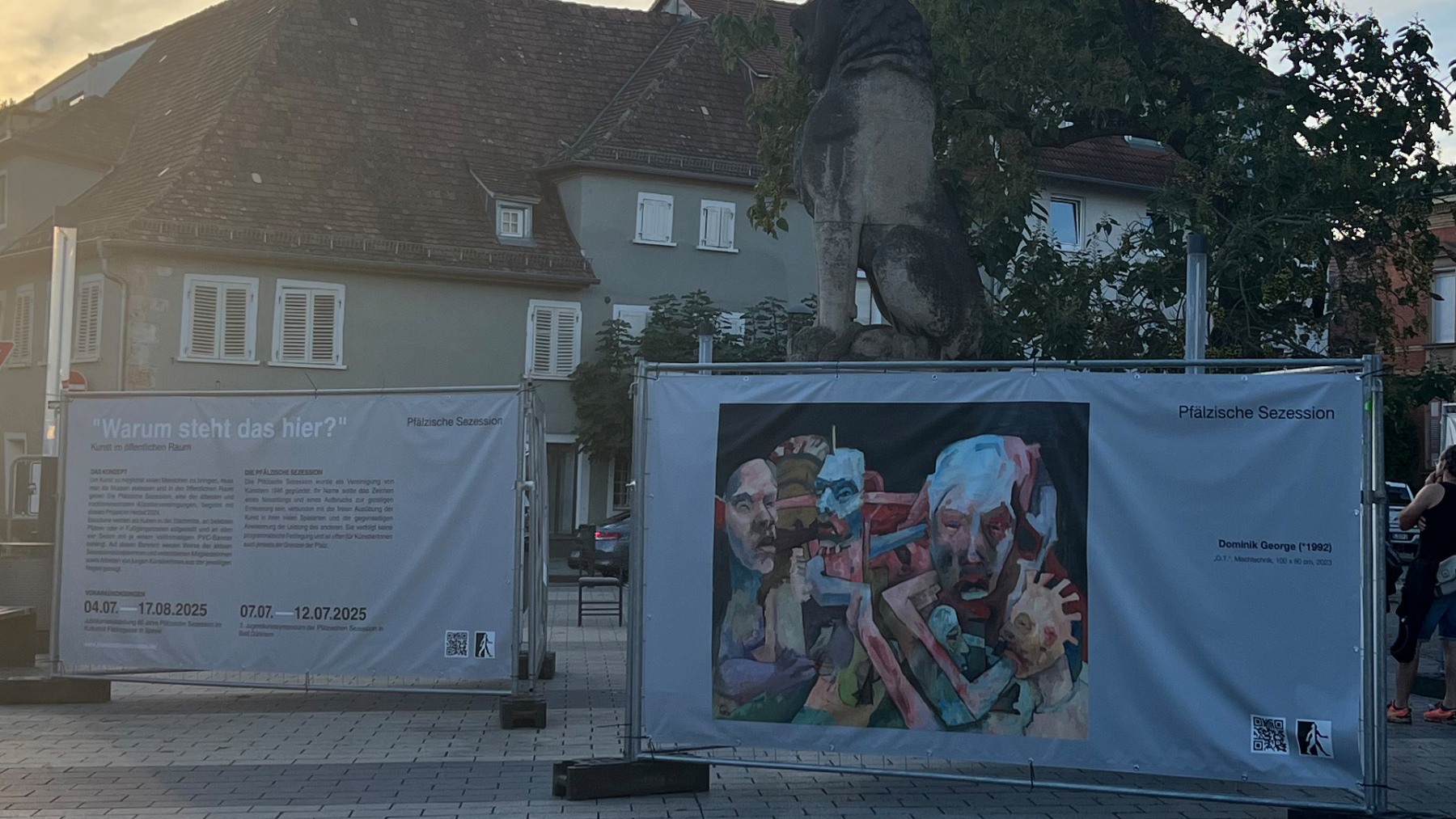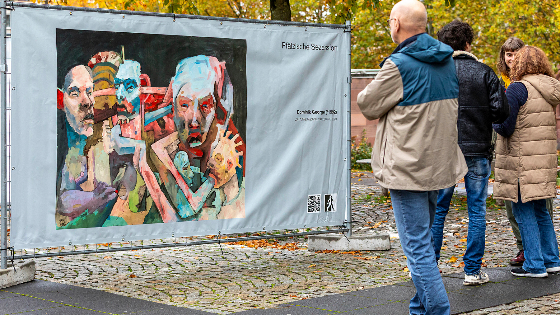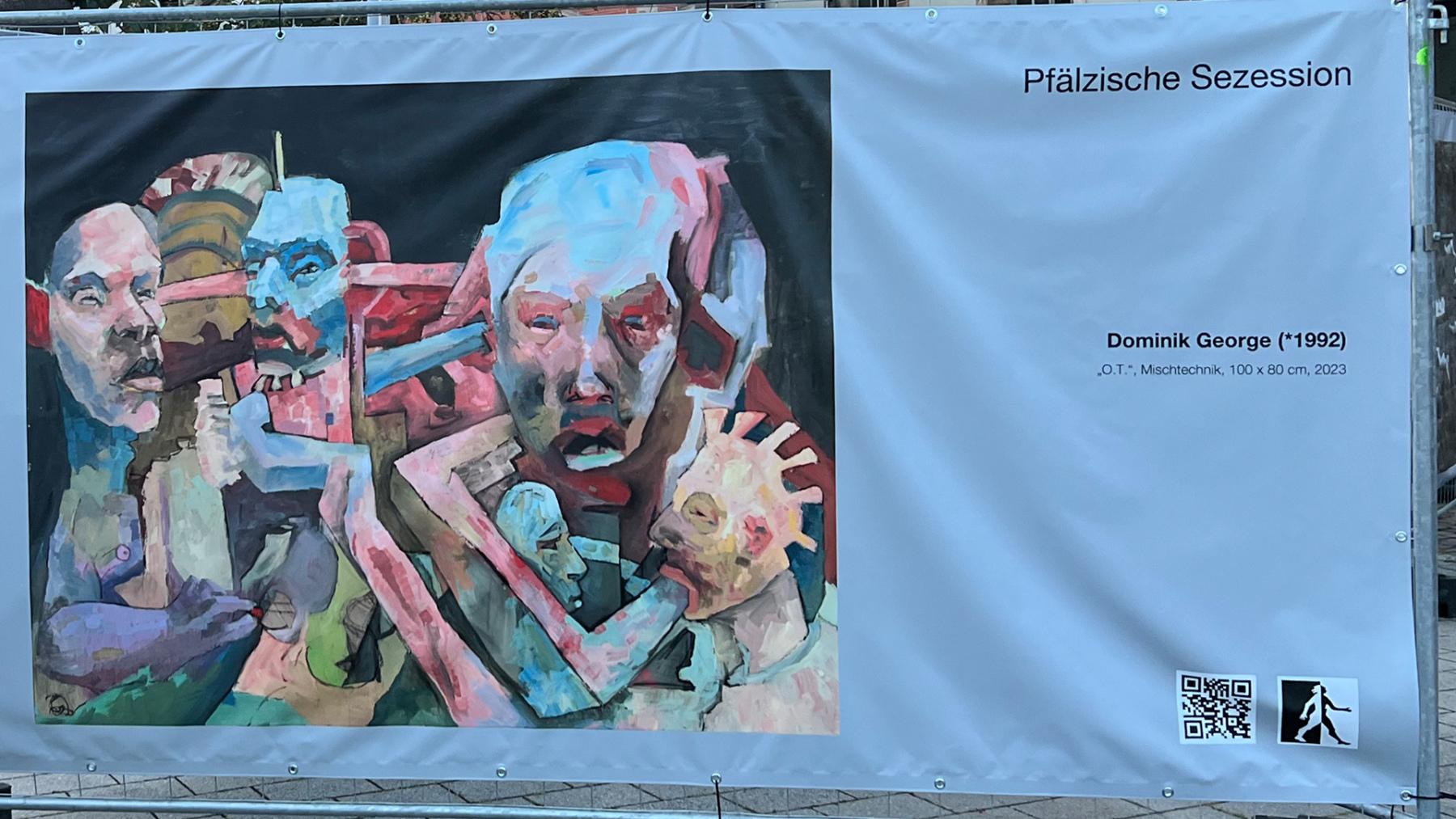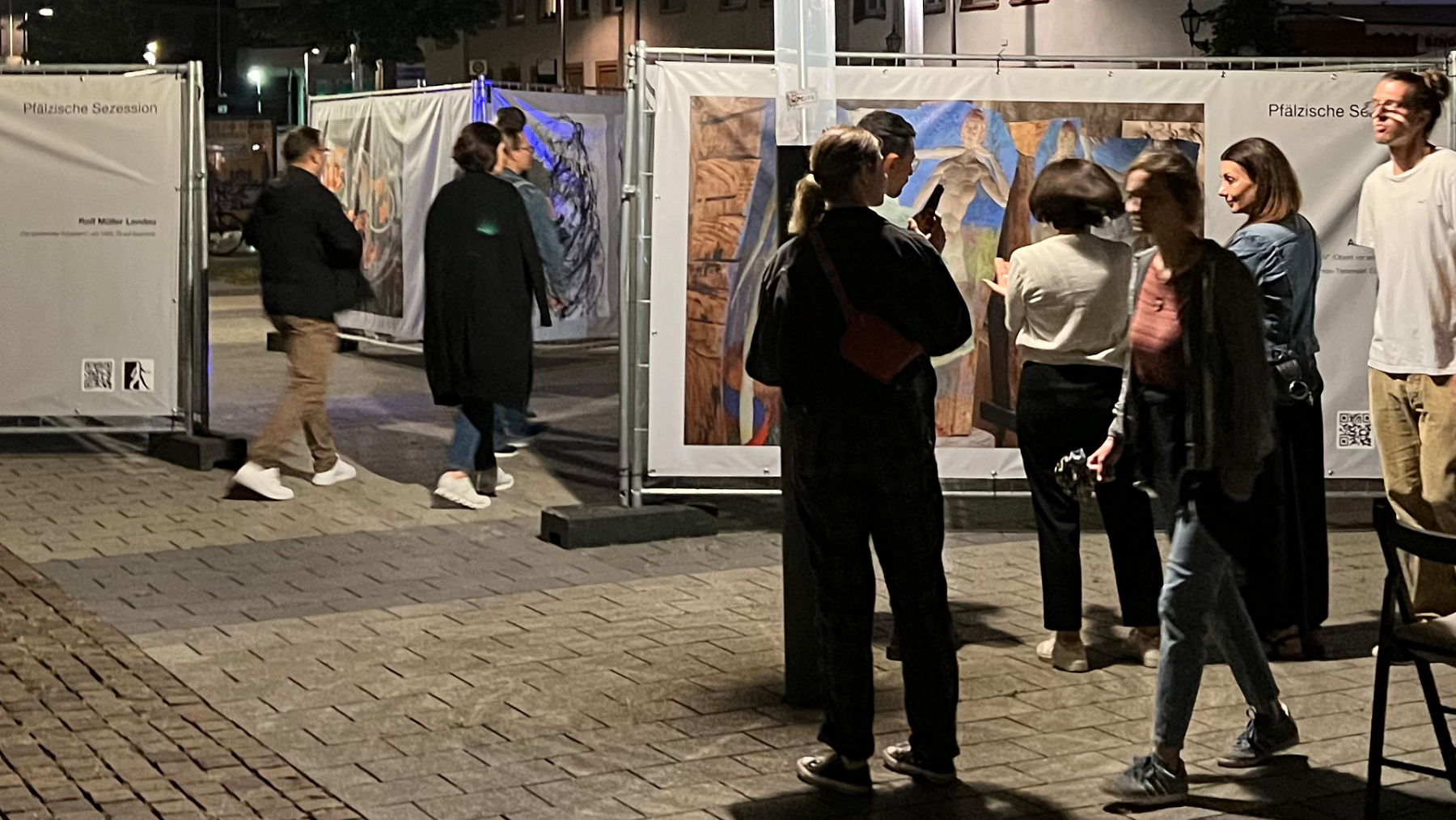 Die Pfälzische Sezession brachte 16 großformatige Banner mit aktuellen Kunstwerken (Malerei, Grafik, Plastik) nach Kaiserslautern, das Citymanagement kümmert sich um die entsprechende Infrastruktur für die Ausstellung: 4 Wochen im Spätherbst- eine Kunstausstellung im öffentlichen Raum, für alle Menschen in der Stadt, 24 Stunden am Tag. Da dieser Platz gerne von jungen Menschen unterschiedlicher Nationalität genutzt wird, war es super zu erleben, wie Kunst jenseits von Sprach- oder Kulturunterschieden angenommen wird. Die Vernissage auf dem Theatervorplatz wurde künstlerisch begleitet von Present Art Collection (H. Engelhardt, Martin Haberer). Trotz Regen kamen Besucher und es gab wieder regen Austausch über Kunst, begleitet von Musik und Cremant … Germersheim in der Planung/2026