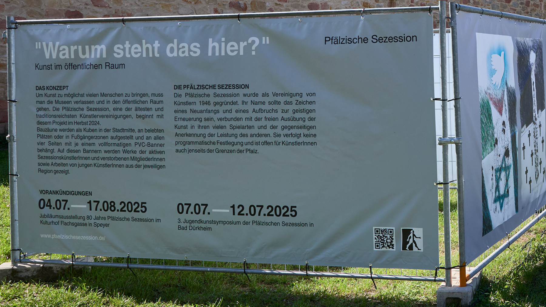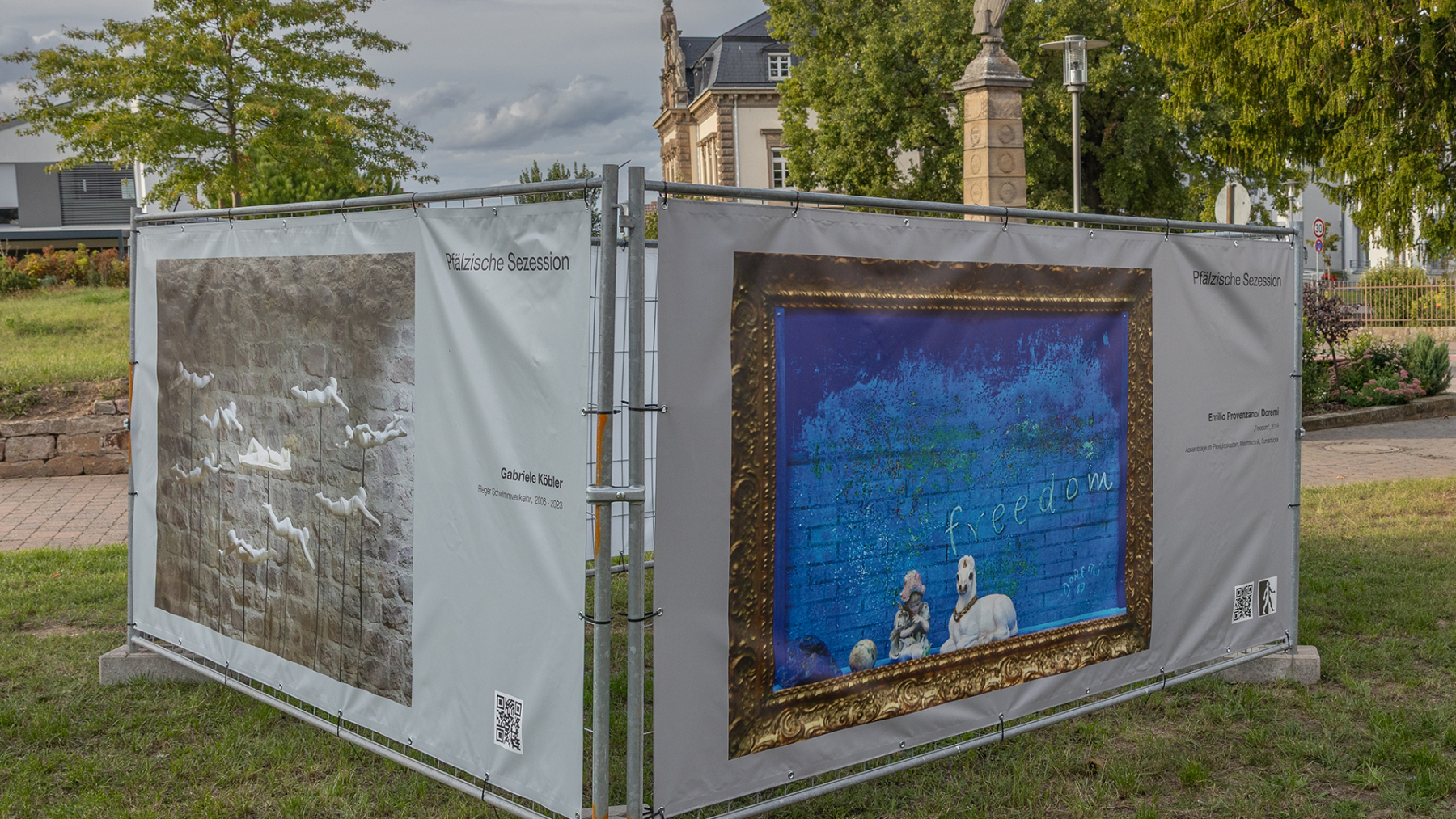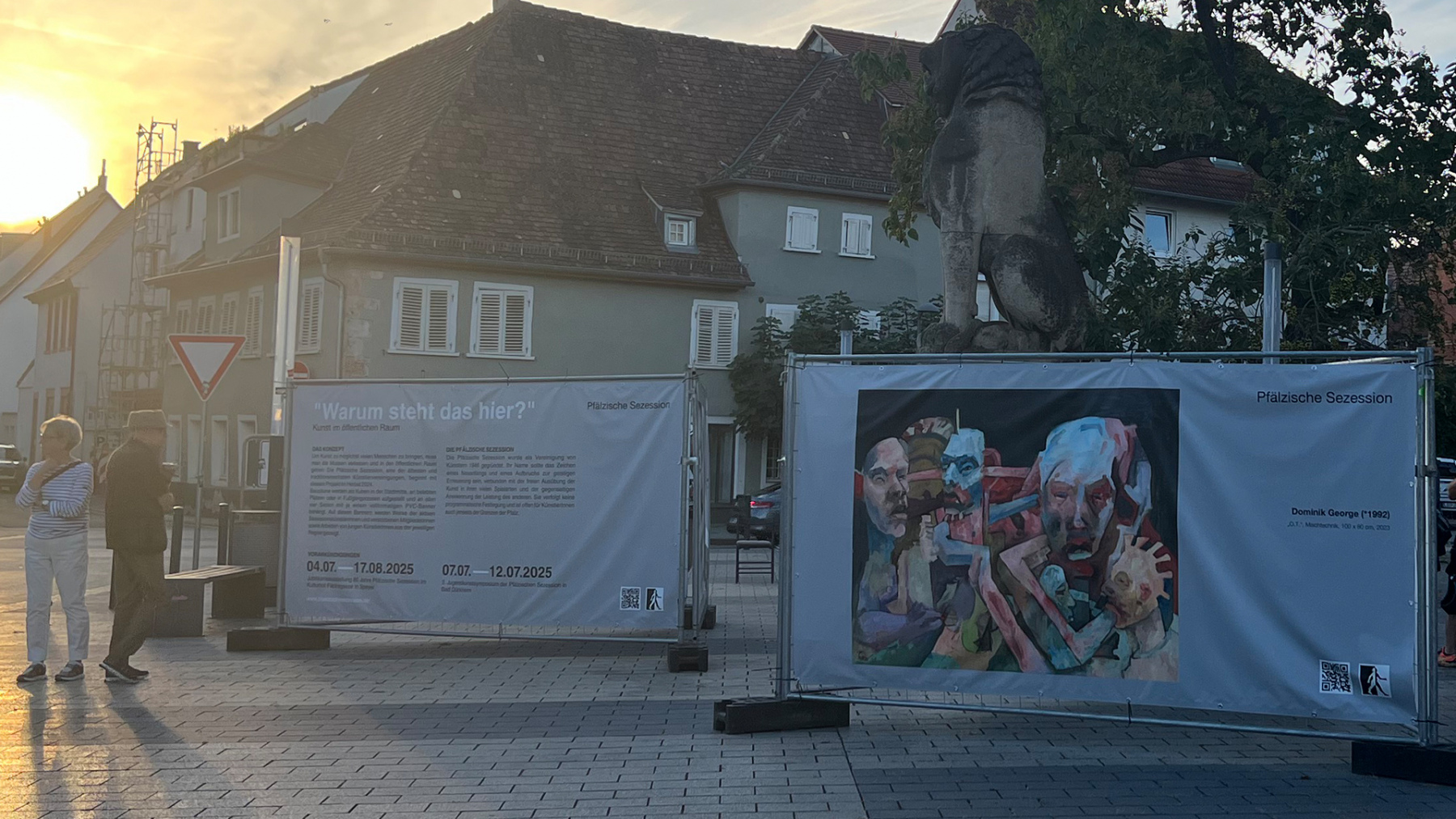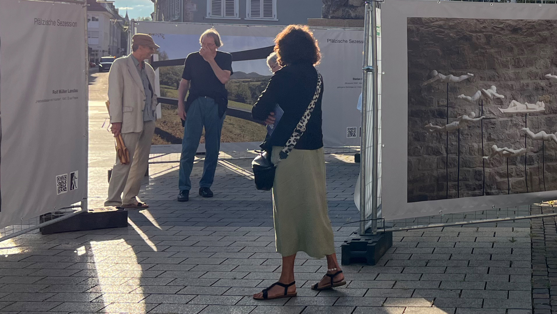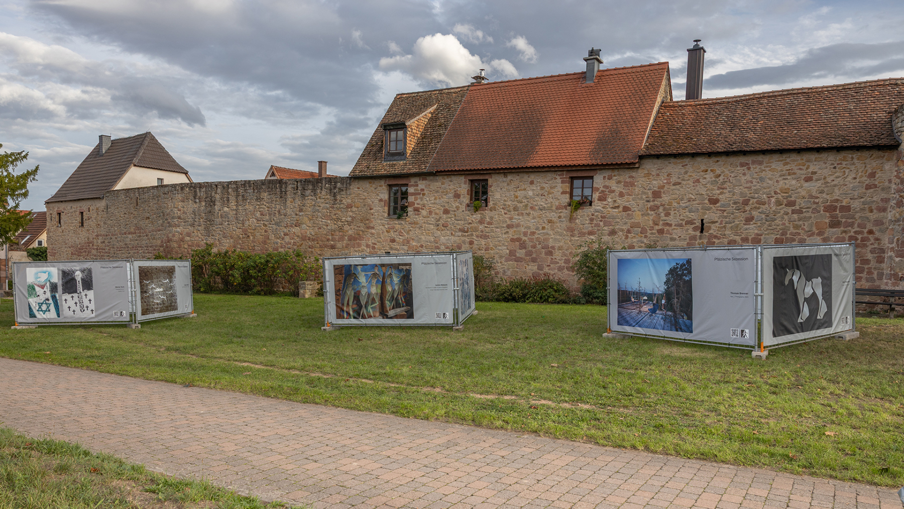 Die Pfälzische Sezession brachte 16 großformatige Banner mit aktuellen Kunstwerken (Malerei, Grafik, Plastik) nach Kaiserslautern, das Citymanagement kümmert sich um die entsprechende Infrastruktur für die Ausstellung: 4 Wochen im Spätherbst- eine Kunstausstellung im öffentlichen Raum, für alle Menschen in der Stadt, 24 Stunden am Tag. Da dieser Platz gerne von jungen Menschen unterschiedlicher Nationalität genutzt wird, war es super zu erleben, wie Kunst jenseits von Sprach- oder Kulturunterschieden angenommen wird. Die Vernissage auf dem Theatervorplatz wurde künstlerisch begleitet von Present Art Collection (H. Engelhardt, Martin Haberer). Trotz Regen kamen Besucher und es gab wieder regen Austausch über Kunst, begleitet von Musik und Cremant … Germersheim in der Planung/2026