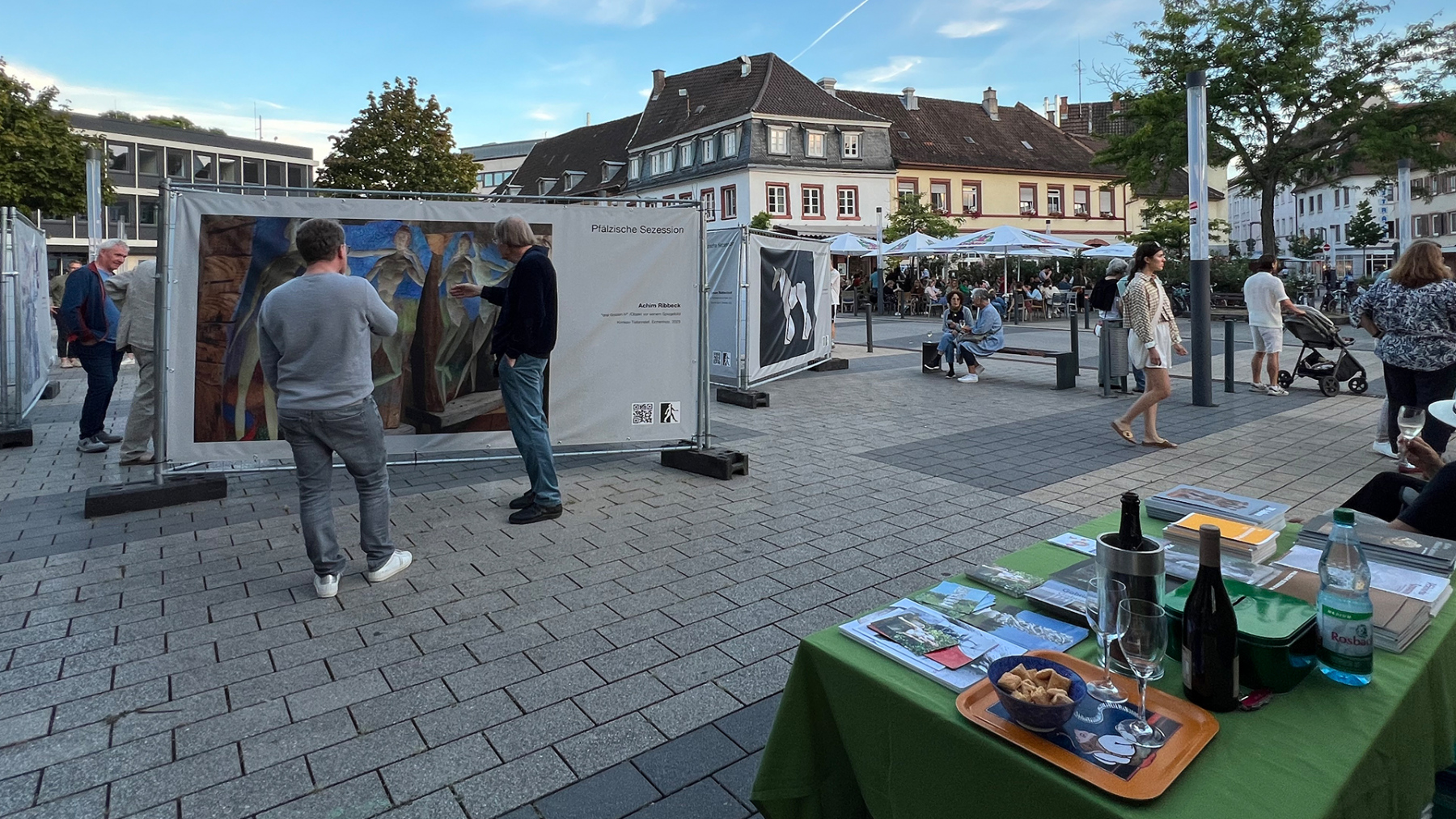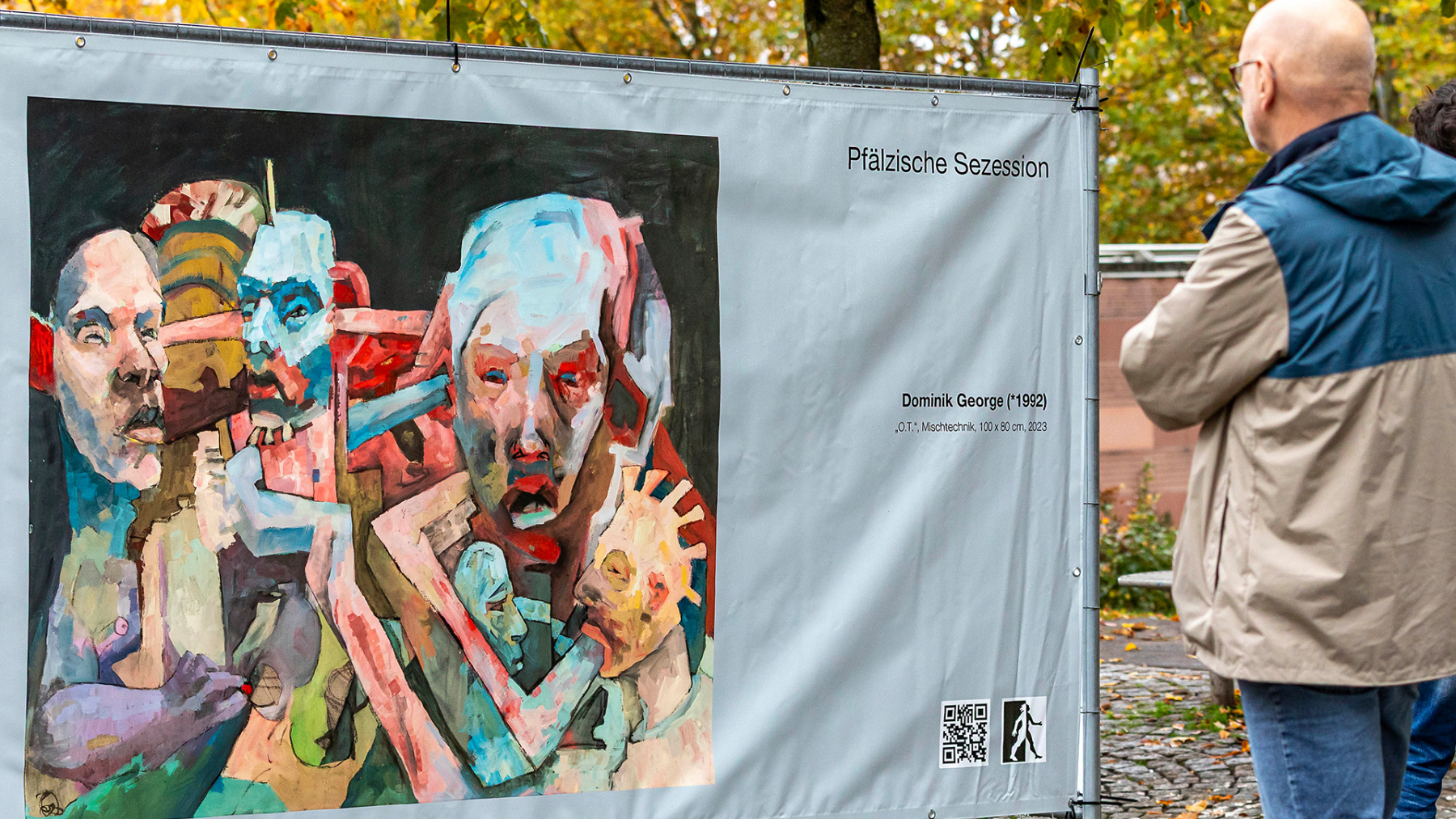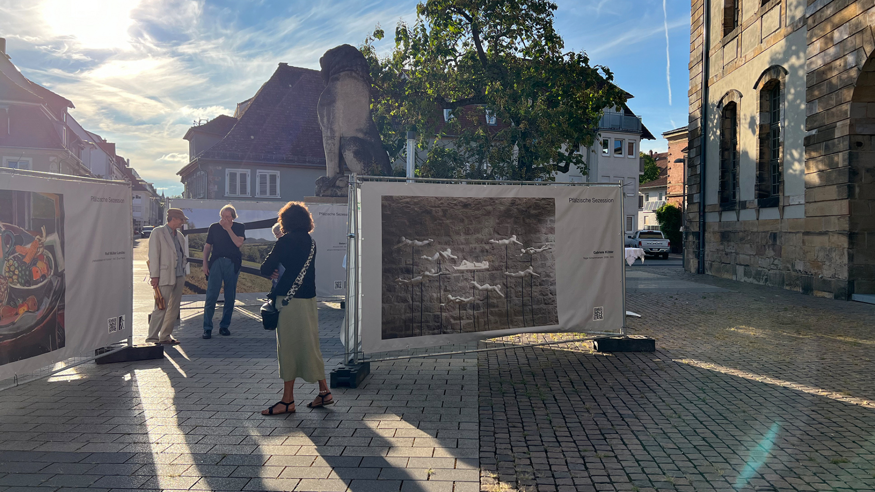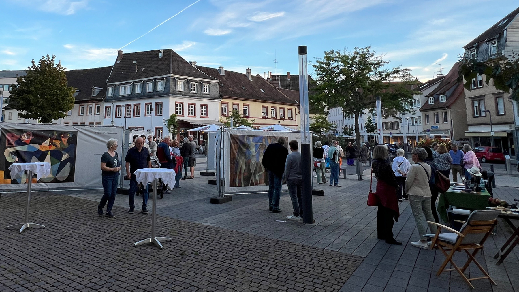 Die Pfälzische Sezession brachte 16 großformatige Banner mit aktuellen Kunstwerken (Malerei, Grafik, Plastik) nach Kaiserslautern, das Citymanagement kümmert sich um die entsprechende Infrastruktur für die Ausstellung: 4 Wochen im Spätherbst- eine Kunstausstellung im öffentlichen Raum, für alle Menschen in der Stadt, 24 Stunden am Tag. Da dieser Platz gerne von jungen Menschen unterschiedlicher Nationalität genutzt wird, war es super zu erleben, wie Kunst jenseits von Sprach- oder Kulturunterschieden angenommen wird. Die Vernissage auf dem Theatervorplatz wurde künstlerisch begleitet von Present Art Collection (H. Engelhardt, Martin Haberer). Trotz Regen kamen Besucher und es gab wieder regen Austausch über Kunst, begleitet von Musik und Cremant … Germersheim in der Planung/2026