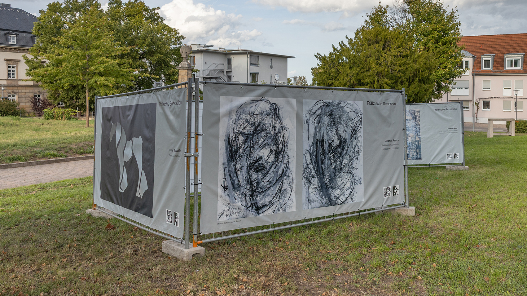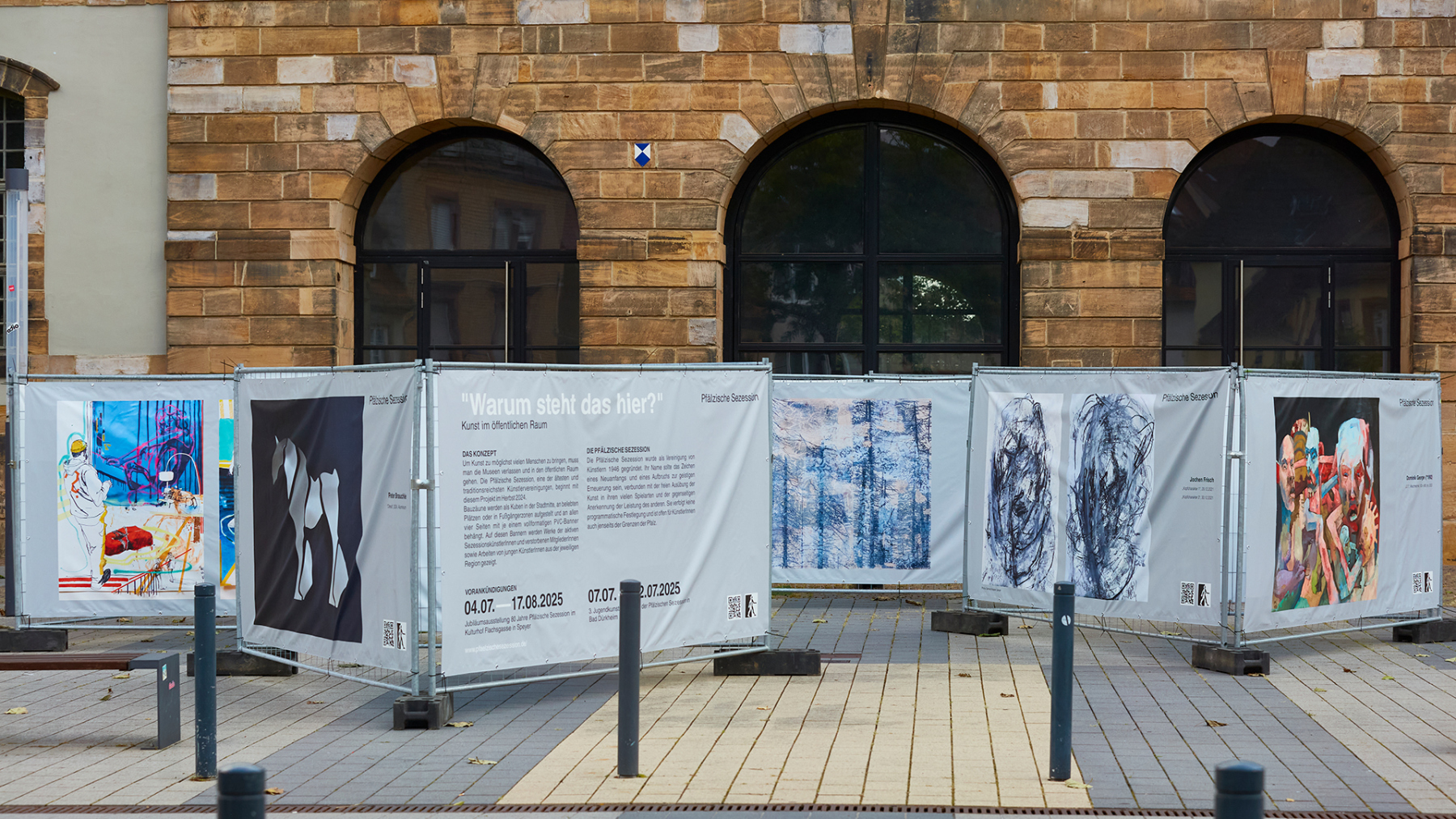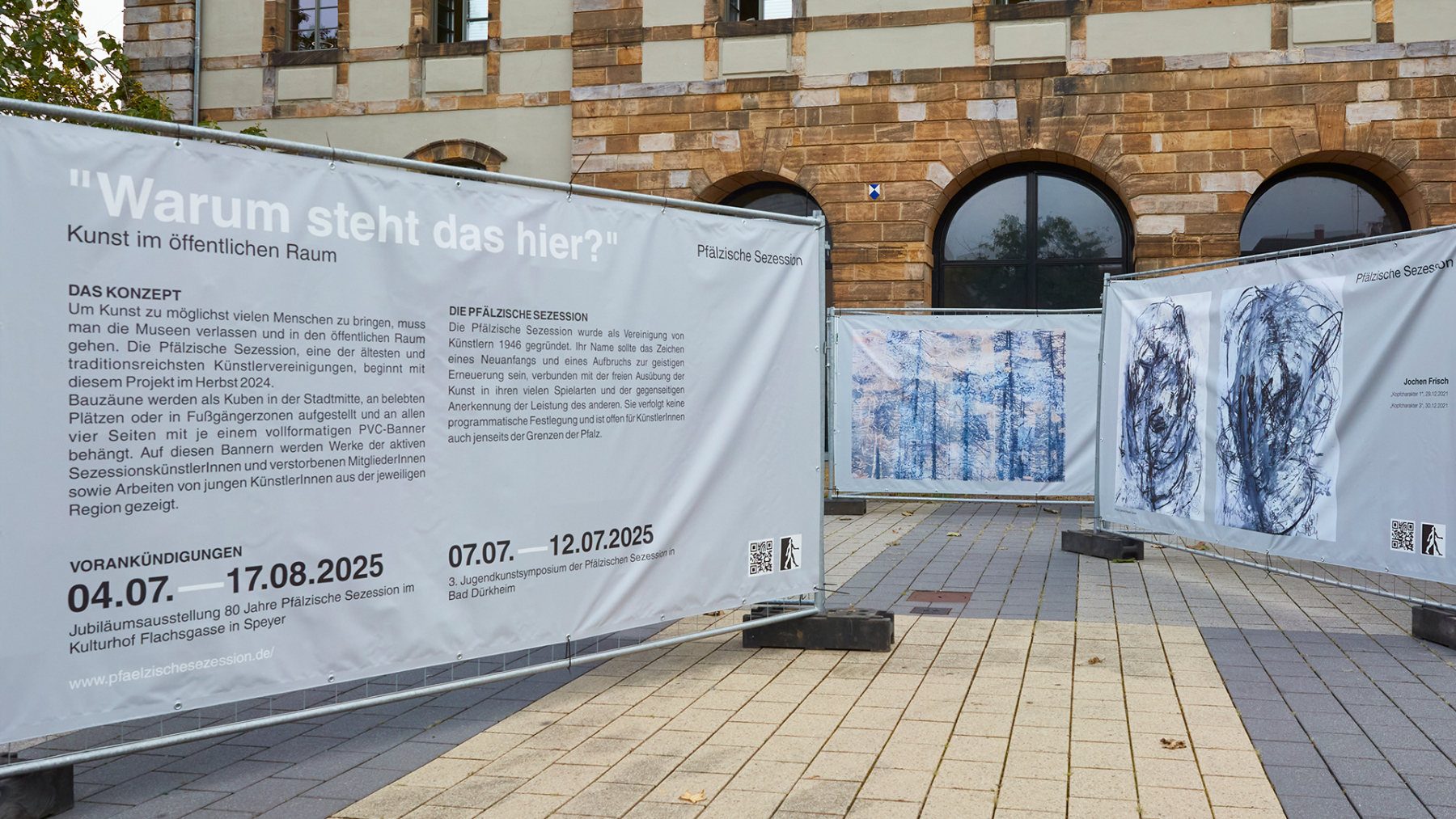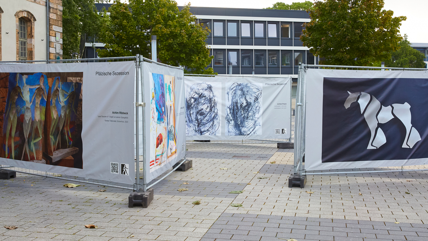 DAS KONZEPT Um Kunst einem möglichst breiten Publikum zugänglich zu machen, verlässt die Pfälzische Sezession bewusst die klassischen Ausstellungsräume und bringt ihre Werke direkt in den öffentlichen Raum. Dabei werden Bauzäune als würfelförmige Installationen an zentralen Orten der Stadt wie belebten Plätzen oder Fußgängerzonen aufgestellt. Jede Seite dieser Kuben wird mit großformatigen PVC-Bannern bespannt, auf denen Werke von aktiven und ehemaligen Kunstschaffenden der Pfälzischen Sezession sowie Arbeiten junger Kreativer aus der jeweiligen Region präsentiert werden. So kann man die präsentierten Inhalte immer variieren und aktualisieren, die Menge der Kuben dem Platzangebot anpassen. Außerhalb von Galerien und Ateliers soll Kunst den Menschen zugänglich gemacht werden, eine Art Streetart, die Menschen auf eine andere Art abholt.Eine Vernissage, um mit den ausstellenden Künstlern ins Gespräch zu kommen, ist der Auftakt jeder Ausstellung, die ca. 4 – 6 Wochen gezeigt wird.