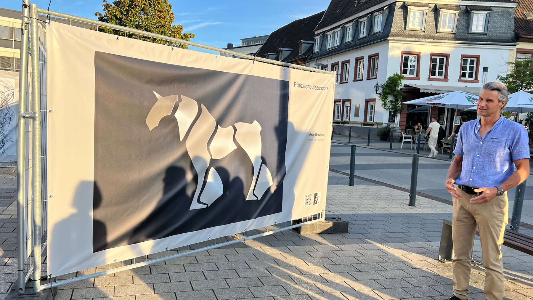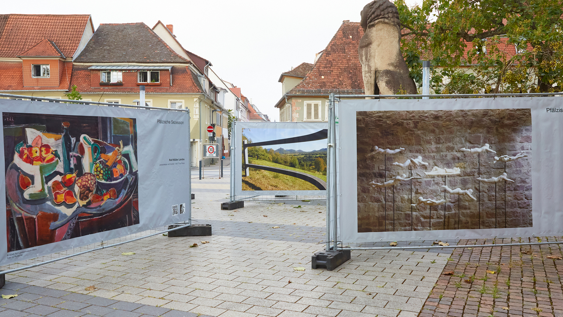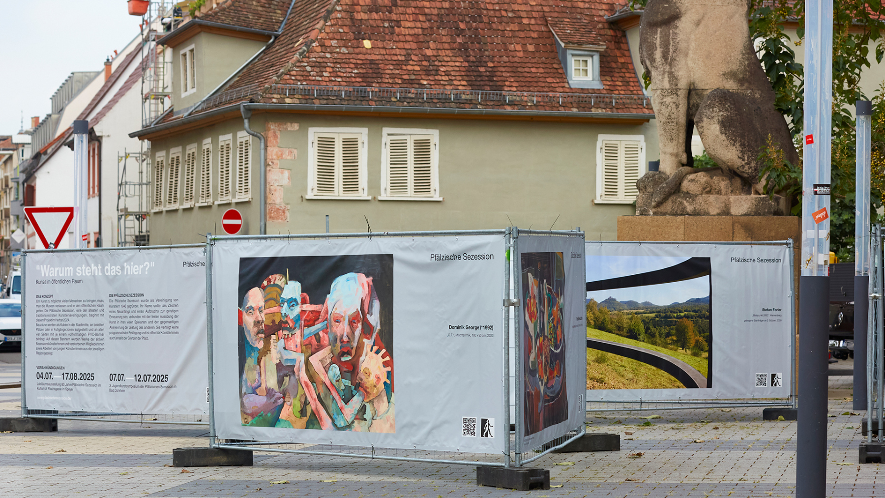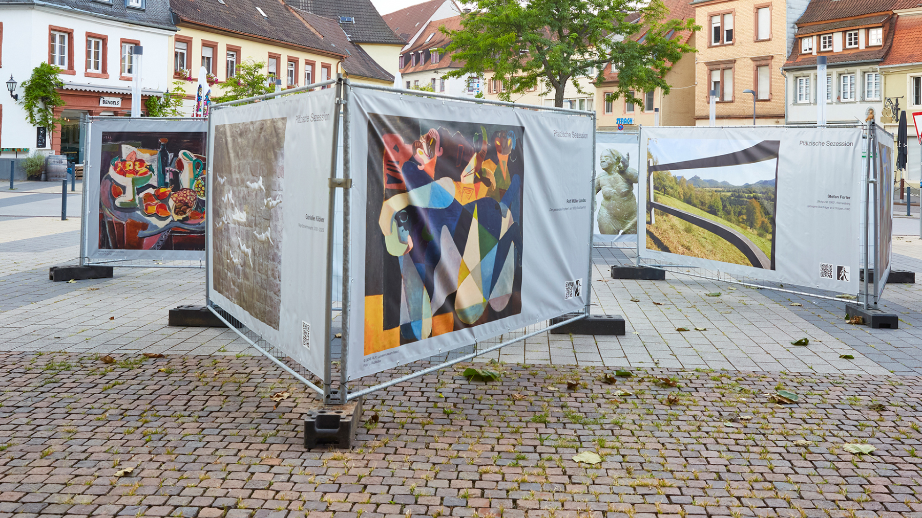 DAS KONZEPT Um Kunst einem möglichst breiten Publikum zugänglich zu machen, verlässt die Pfälzische Sezession bewusst die klassischen Ausstellungsräume und bringt ihre Werke direkt in den öffentlichen Raum. Dabei werden Bauzäune als würfelförmige Installationen an zentralen Orten der Stadt wie belebten Plätzen oder Fußgängerzonen aufgestellt. Jede Seite dieser Kuben wird mit großformatigen PVC-Bannern bespannt, auf denen Werke von aktiven und ehemaligen Kunstschaffenden der Pfälzischen Sezession sowie Arbeiten junger Kreativer aus der jeweiligen Region präsentiert werden. So kann man die präsentierten Inhalte immer variieren und aktualisieren, die Menge der Kuben dem Platzangebot anpassen. Außerhalb von Galerien und Ateliers soll Kunst den Menschen zugänglich gemacht werden, eine Art Streetart, die Menschen auf eine andere Art abholt.Eine Vernissage, um mit den ausstellenden Künstlern ins Gespräch zu kommen, ist der Auftakt jeder Ausstellung, die ca. 4 – 6 Wochen gezeigt wird.